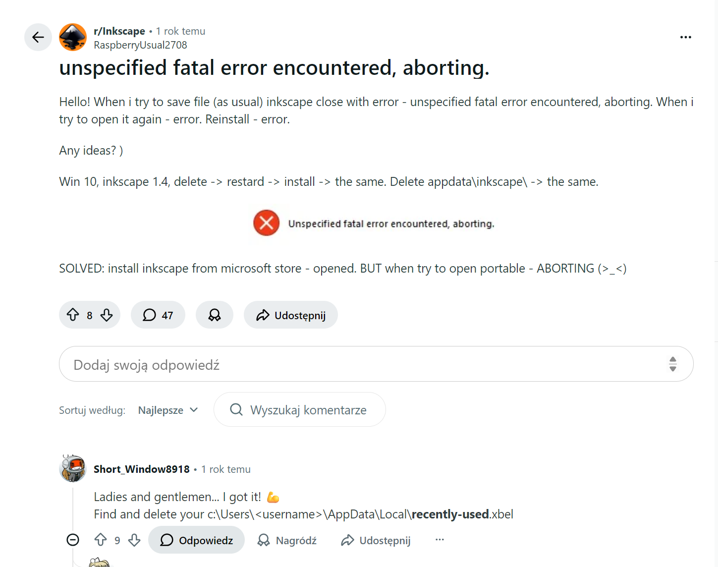 Właśnie nie. Wyłączyłem, włączyłem i błąd. Pierwsze podejrzenie, uległ awarii plik svg. Co lepsze, przeinstalowanie inkscape też nie pomogło. Trzeba było usunąć ten pliczek. Folder AppData ukryty.